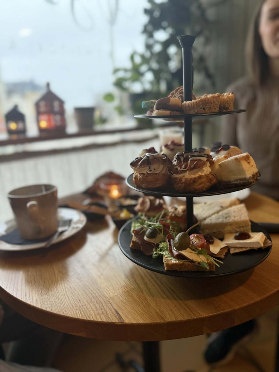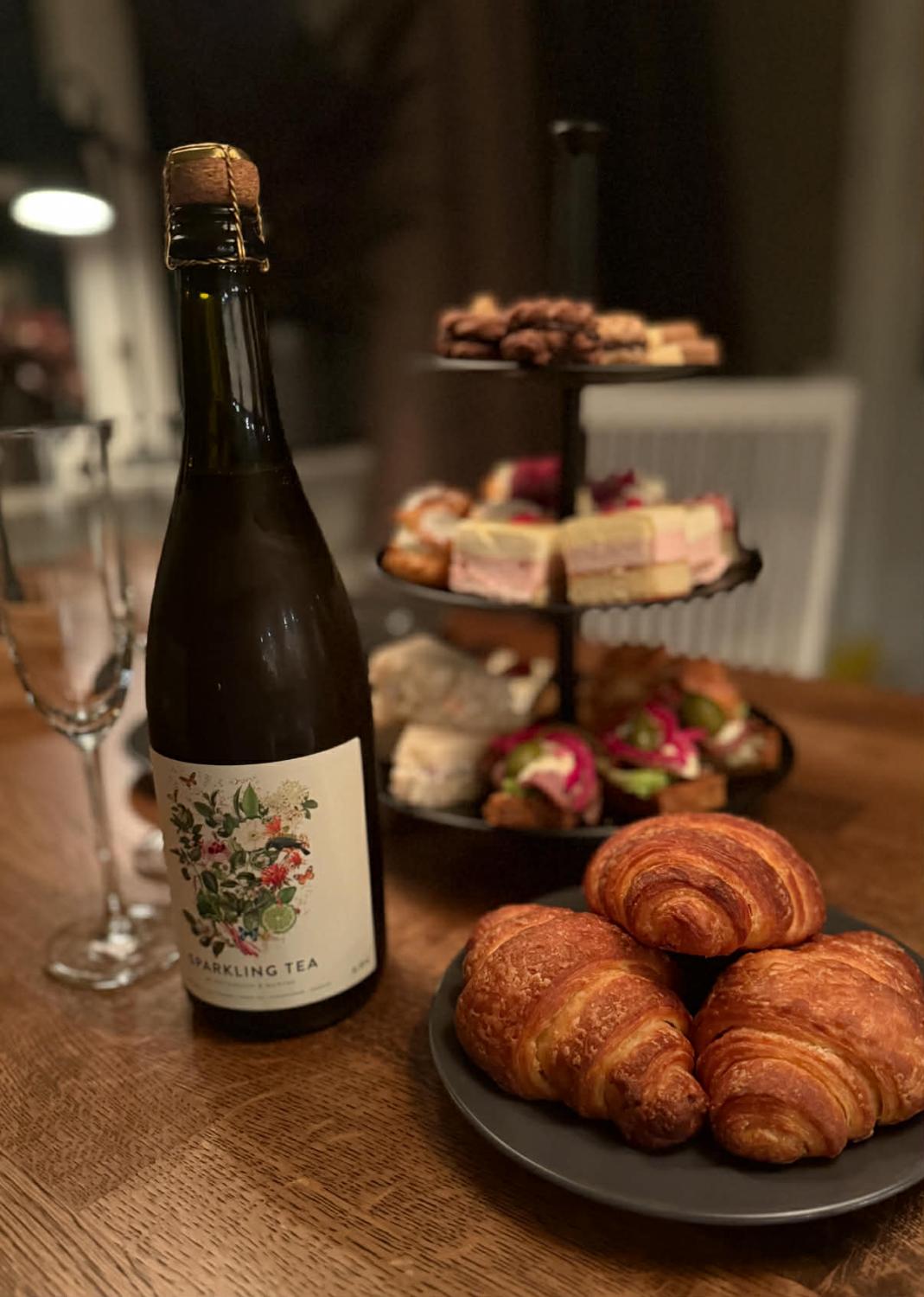 Vi dukar upp ett dignande fat fullt av söta och salta godsaker, nybakade croissanter med sylt och färskost, och till det serveras ett alkoholfritt sparkling tea samt kaffe eller te.