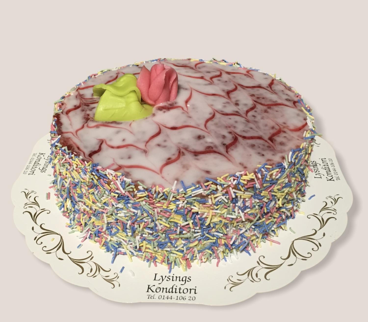 Sockerkaksbottnar med vaniljkräm, hallonsylt och hallongrädde toppad med hallonglasyr och karamellströssel på kanten.