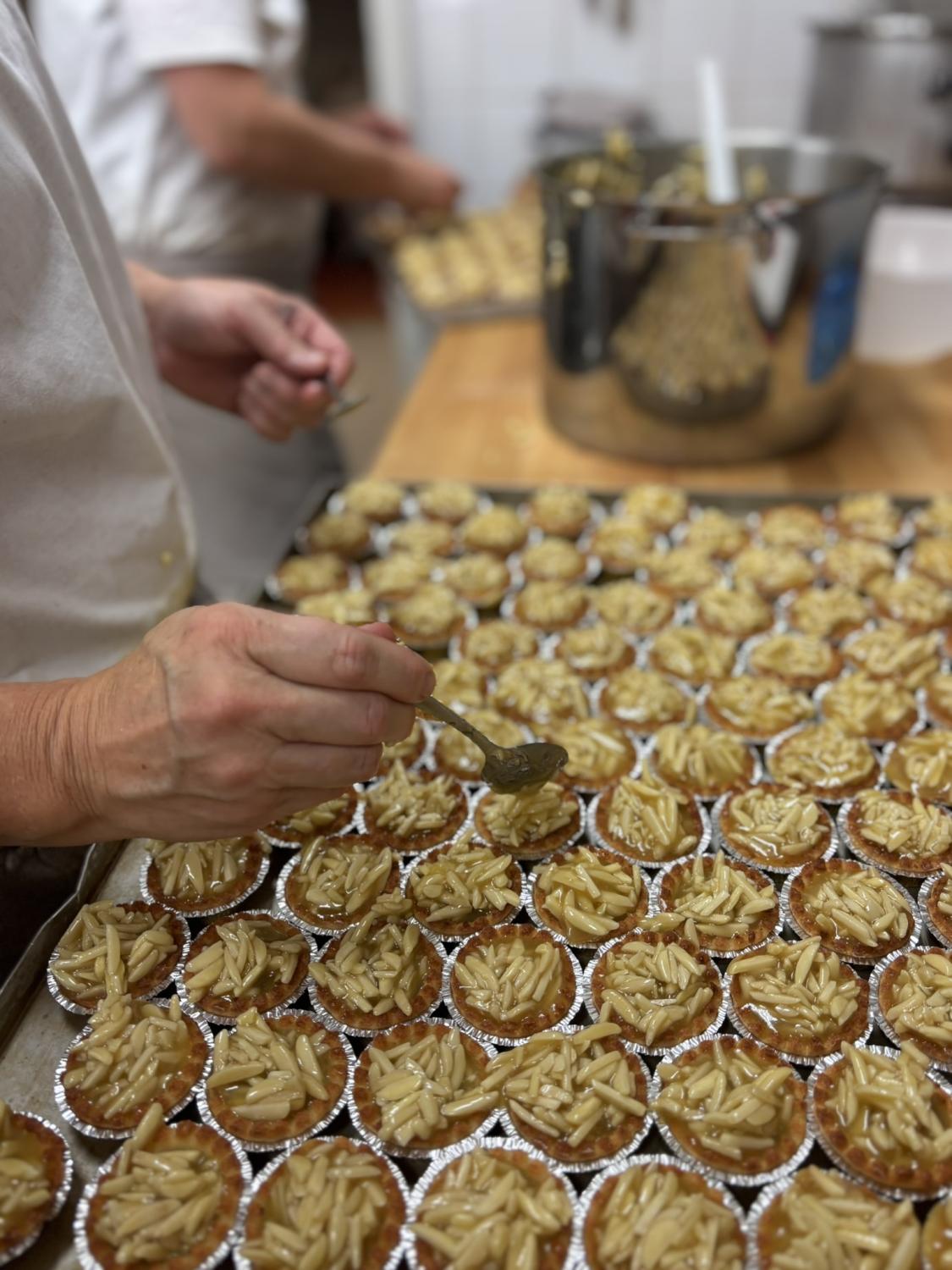 Mandelform fylld med chokladtryffel och toppad med ett mandelknäck.