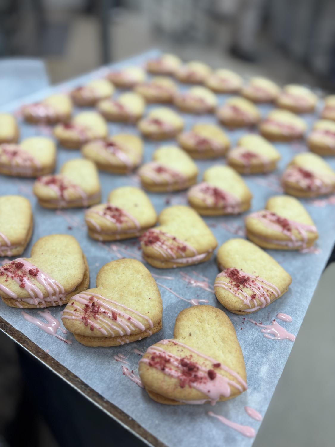 Mördegshjärtan fyllda med hallonsmörkräm.