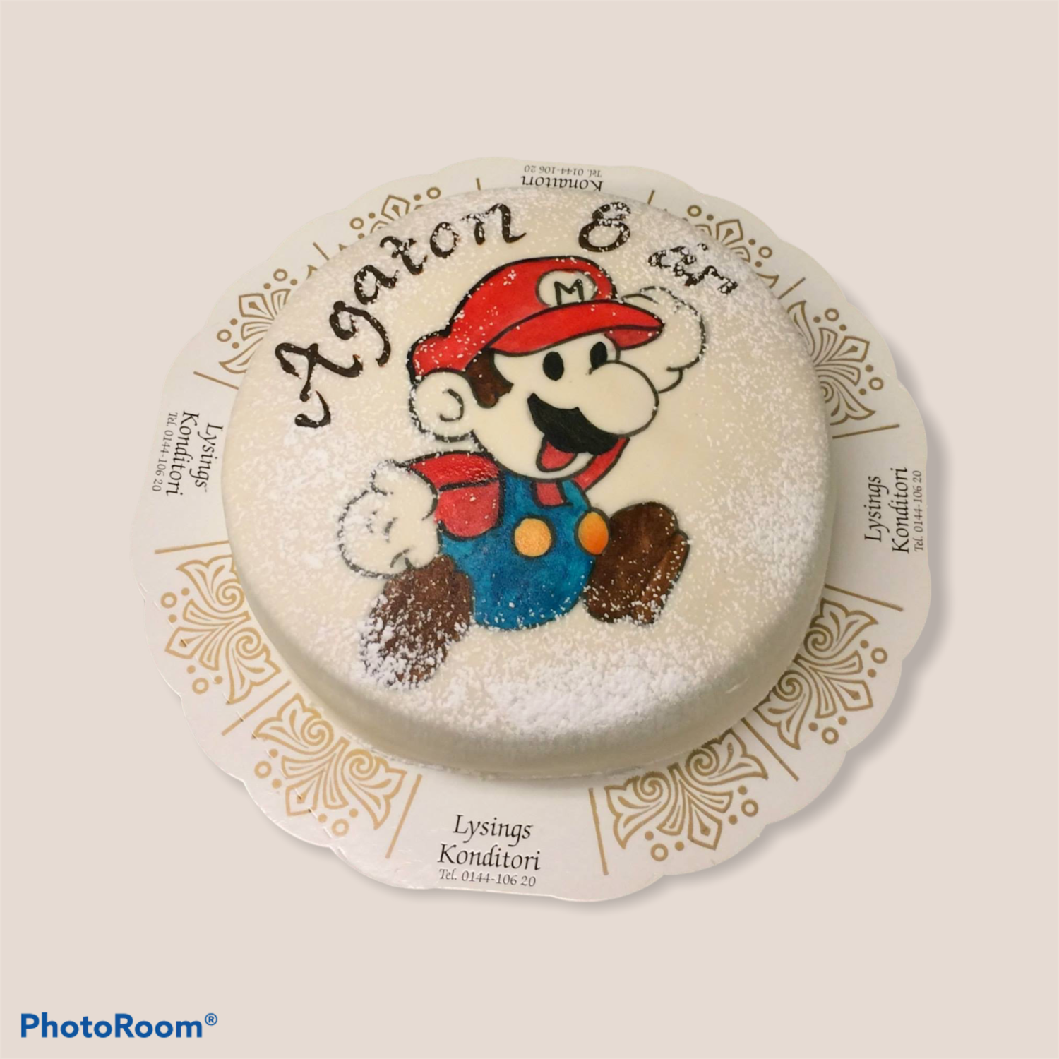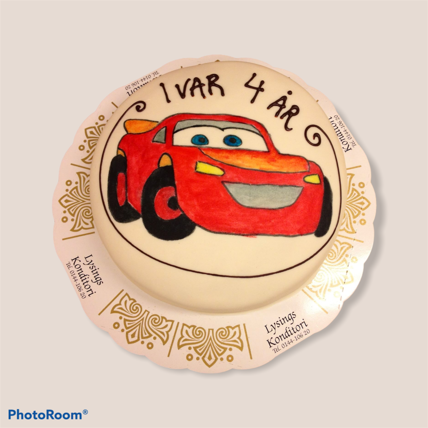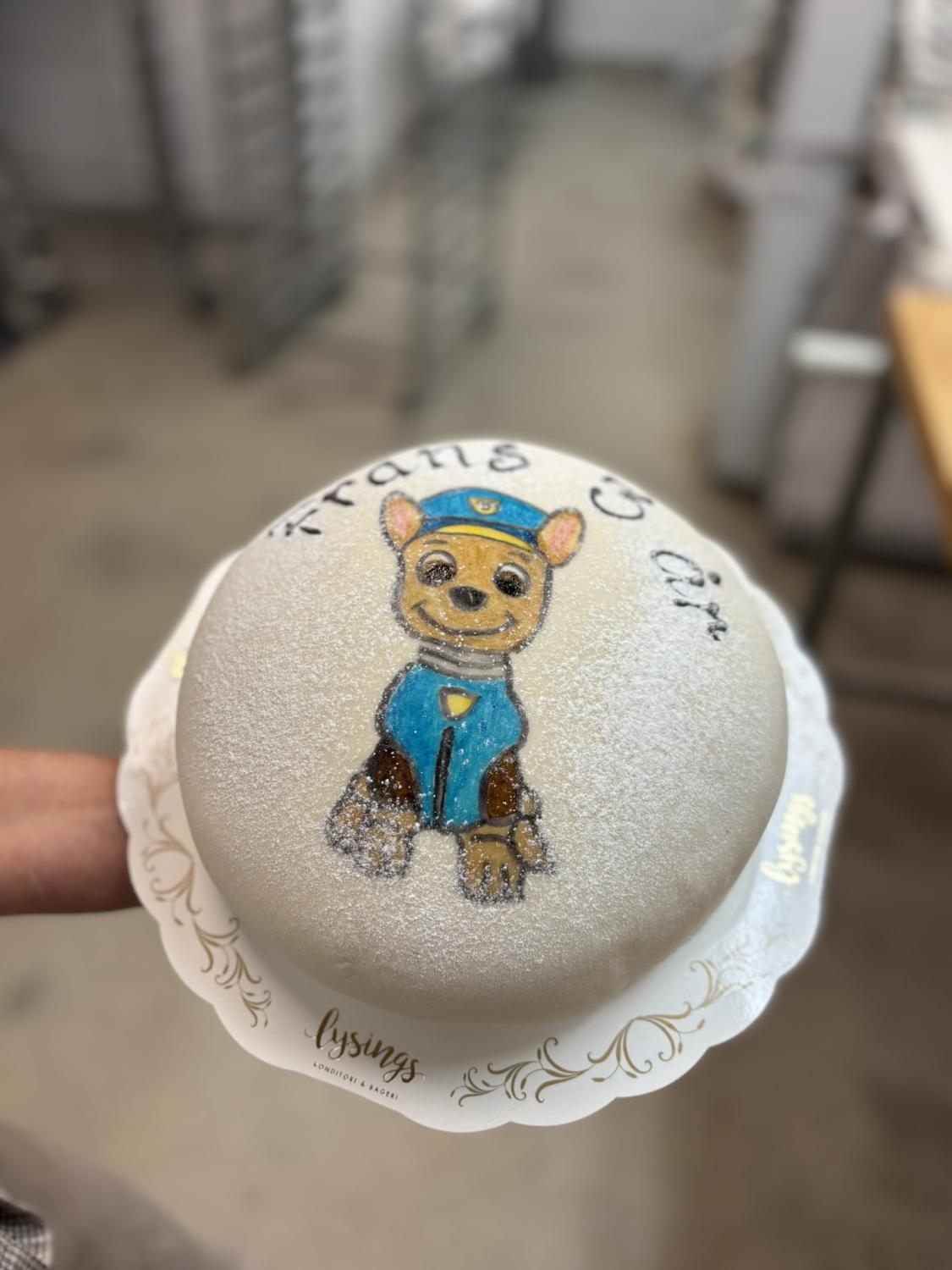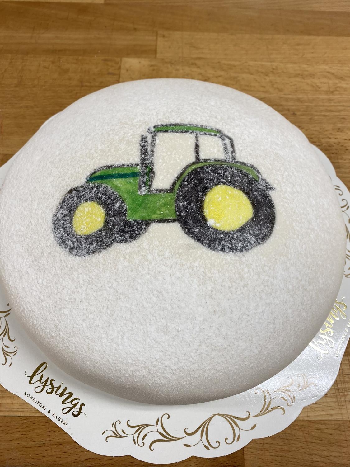 Saftig sockerkaksbotten fylld med vaniljkräm, hallon & grädde. Täckt med vit marsipan som vi målar en valfri bild på.