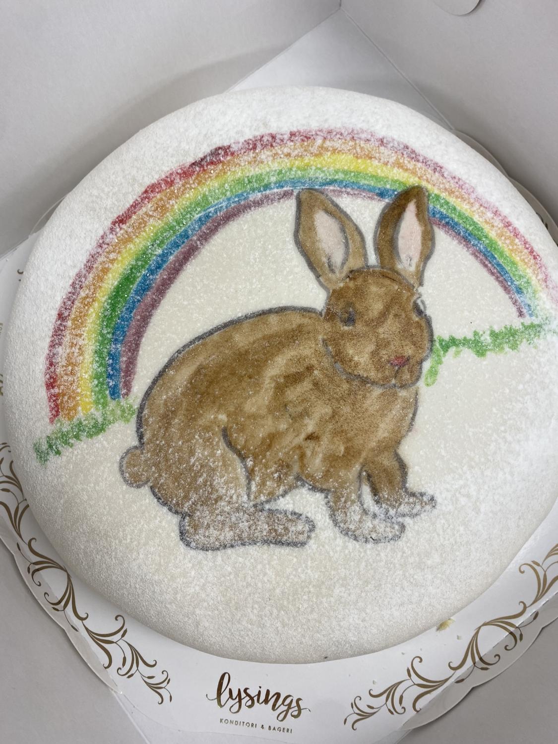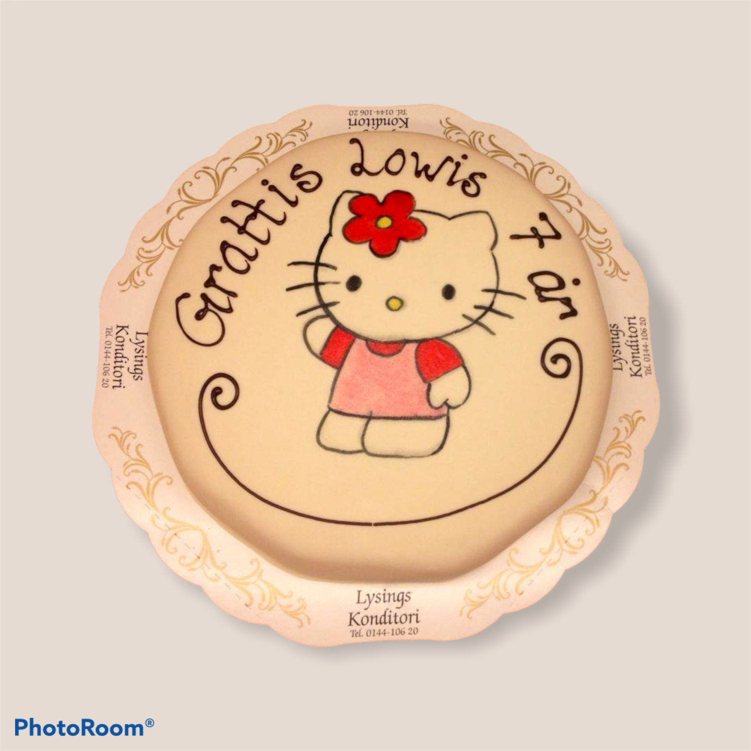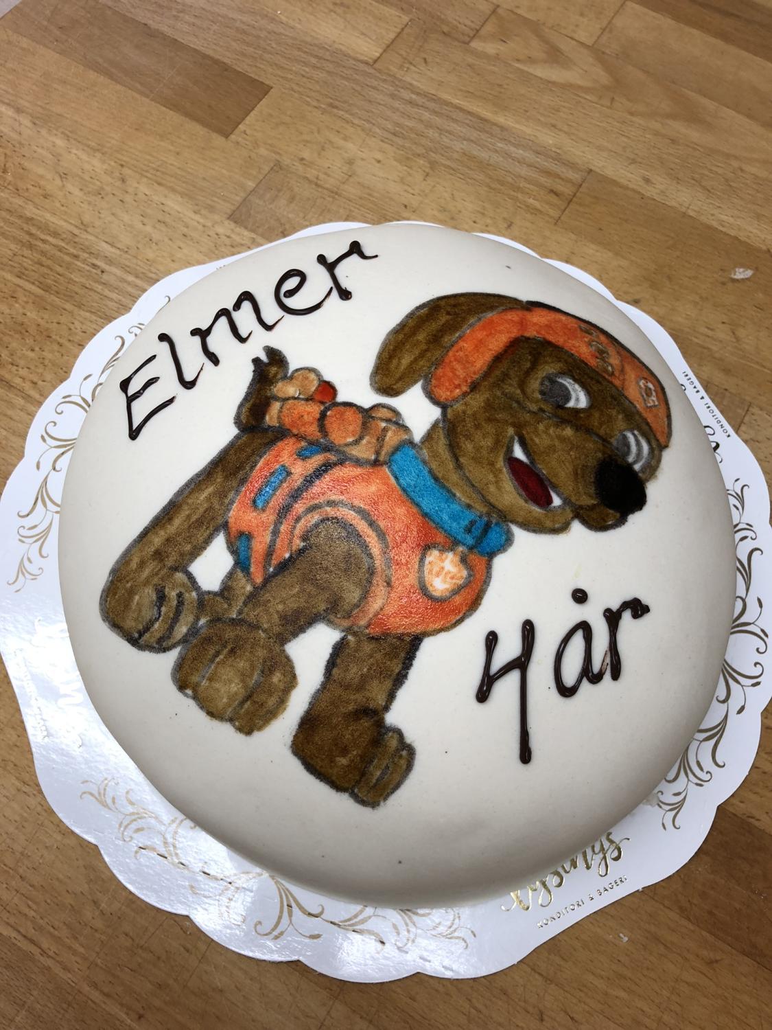 Saftig sockerkaksbotten fylld med vaniljkräm, hallon & grädde. Täckt med vit marsipan som vi målar en valfri bild på.