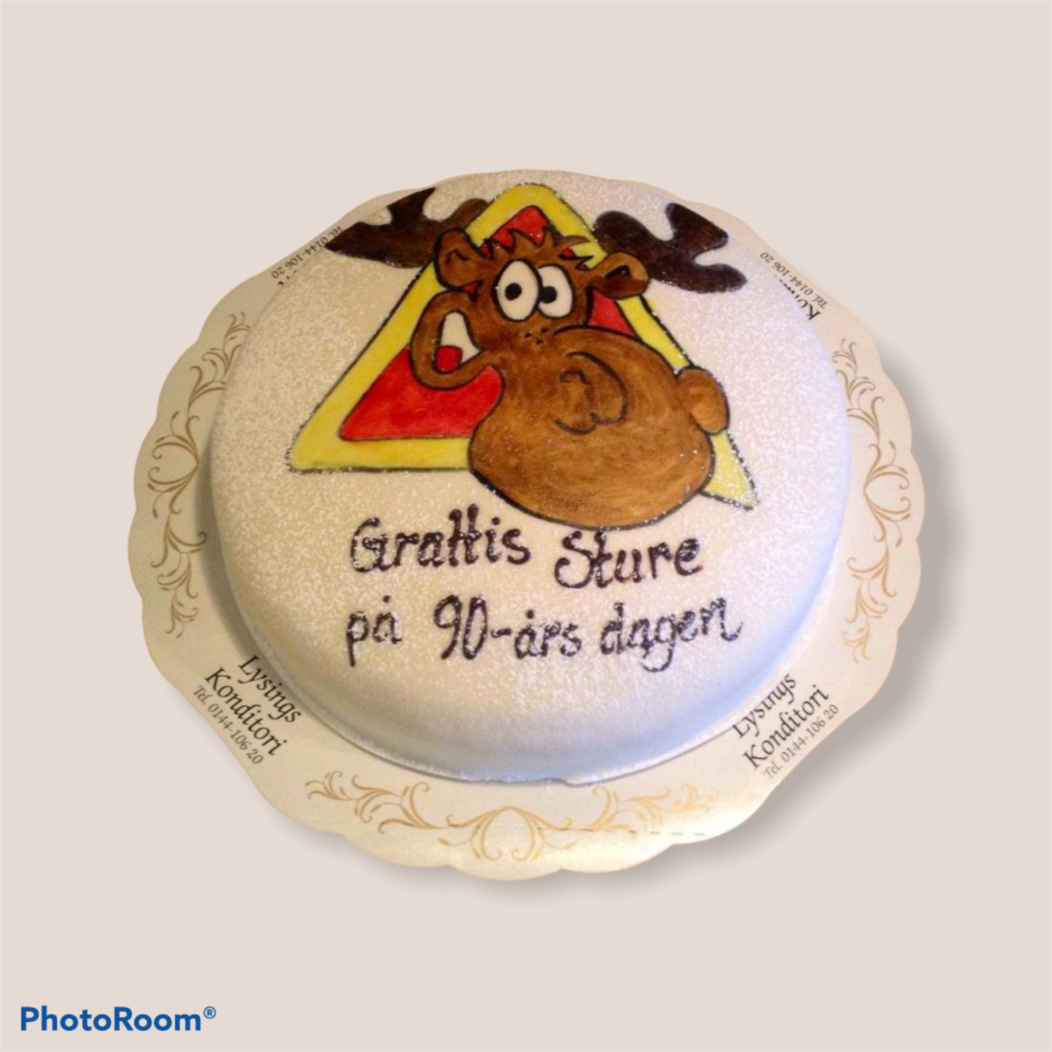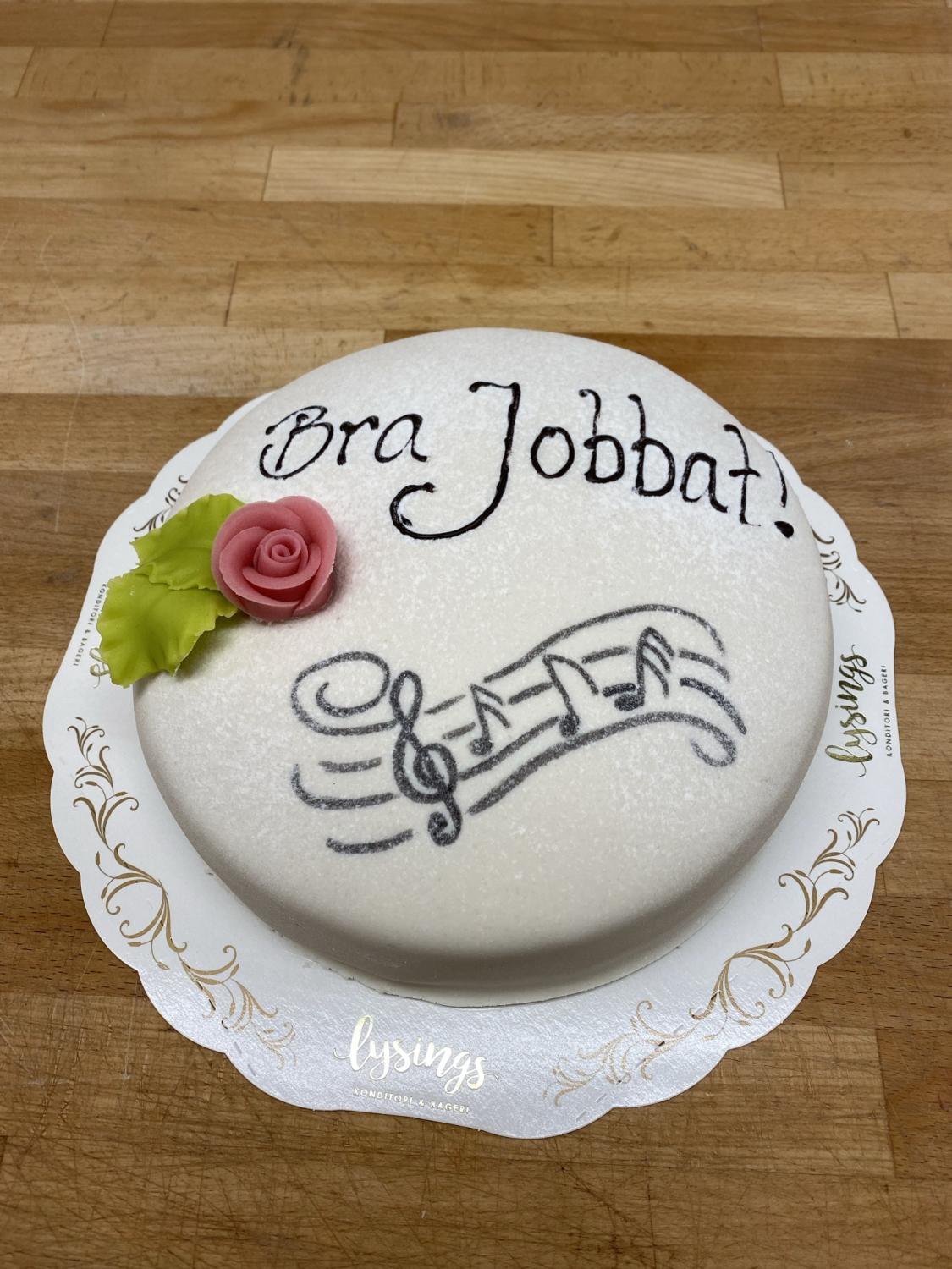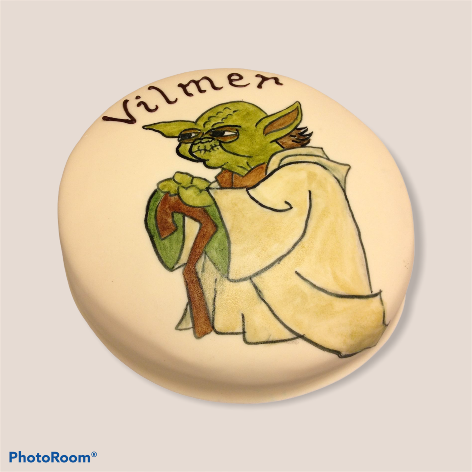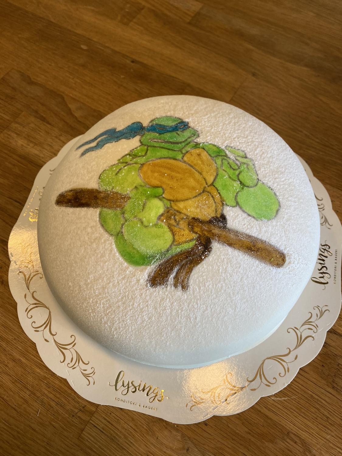 Saftig sockerkaksbotten fylld med vaniljkräm, hallon & grädde. Täckt med vit marsipan som vi målar en valfri bild på.