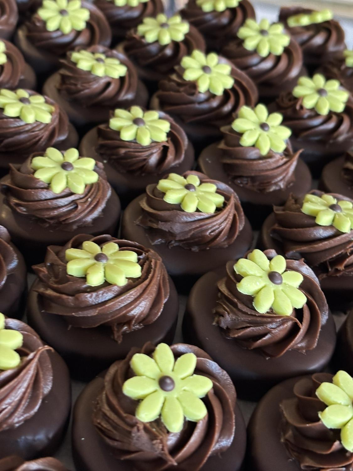 Vår goda browniebotten doppad i choklad, chokladros av vår nöt&choklad ganach toppad med en liten marsipanblomma